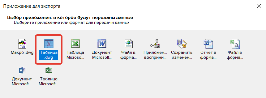 Находясь на листе, откроем Мастер экспорта данных и нашу спецификацию для редактирования. Не заходя в редактирование выборки, нажимаем Далее в открывающихся окнах, пока не окажемся в окне Приложение для экспорта. Чтобы выложить спецификацию на лист, выберем формат Таблица.dwg и нажмём Далее (рис. 42).