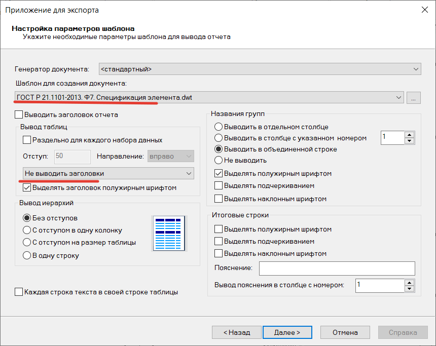 Откроется окно Настройка параметров шаблона, где мы можем выбрать один из предложенных шаблонов или указать путь к своему шаблону. Для нашей спецификации выберем шаблон ГОСТ Р 21.1101-2013. Ф7.Спецификация элемента.dwt, а также укажем, что не надо выводить заголовки для столбцов, т.к. в шаблоне уже есть оформленные заголовки. Нажимаем Далее (рис. 43).