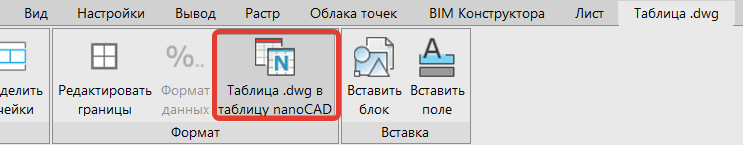 Чтобы внести корректировки в таблицу, воспользуемся редактором таблиц платформы nanoCAD. Для этого выделим таблицу. На ленте инструментов откроется панель работы с таблицами, нажимаем кнопку Таблица .dwg в таблицу nanoCAD (рис.45). После этого двойной щелчок по таблице откроет окно для ее редактирования.