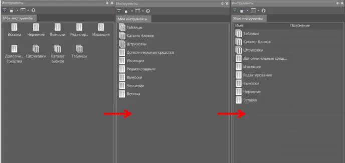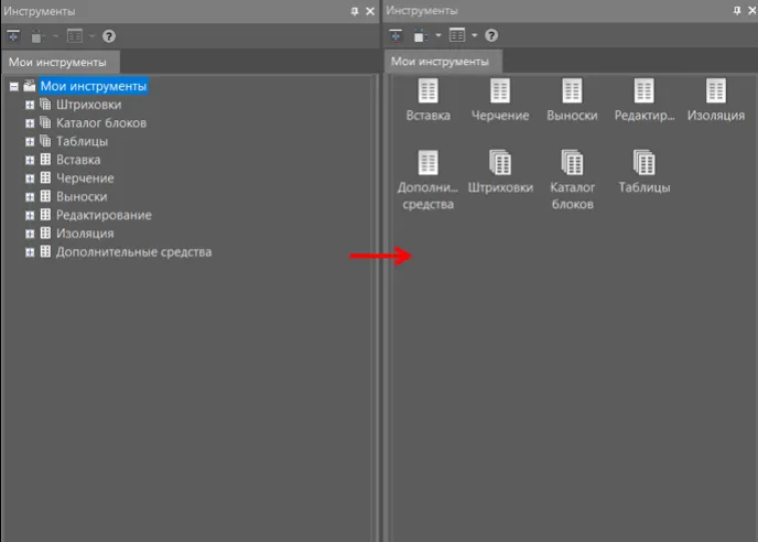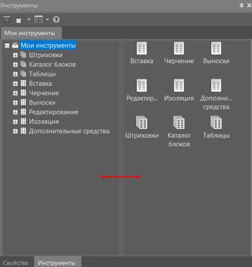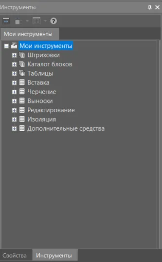 В Платформе nanoCAD такую возможность предоставляет функциональная панель Инструменты, позволяющая создавать и хранить инструменты, соответствующие часто применяемым объектам оформления, библиотекам блоков и т.д. Можно сказать, что эта панель является универсальным механизмом кастомизации части интерфейса, отвечающей за хранение инструментов.