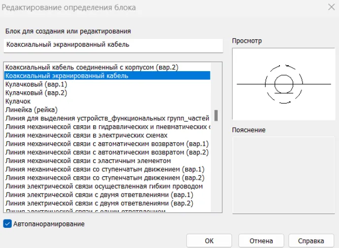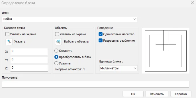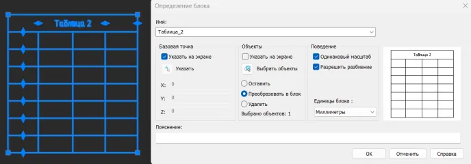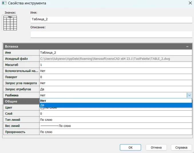 - Разбивка – признак разбиения блока после вставки (Да/Нет). Весьма полезный параметр, позволяющий корректно добавлять на панель Инструменты таблицы и объекты из баз элементов в качестве блоков, о чем мы будем говорить в разделе «Добавление пользовательских объектов».