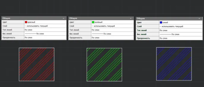 В группе Общие, как и в диалоге Свойства инструмента у штриховки, задаются общие свойства графического объекта (цвет, слой, тип линий, вес линий и прозрачность).