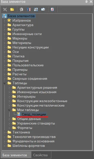 - Откроем функциональную панель База элементов (команда showtablibrary), в которой найдем нашу только что созданную папку с таблицей (рис. 40).