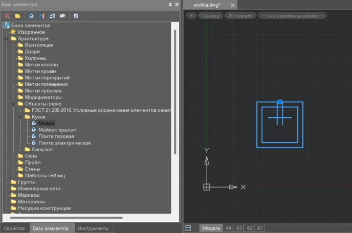 - Откроем модуль «СПДС» и создадим новый файл, в который вставим объект из базы (к примеру, «Мойка») – (рис. 50).