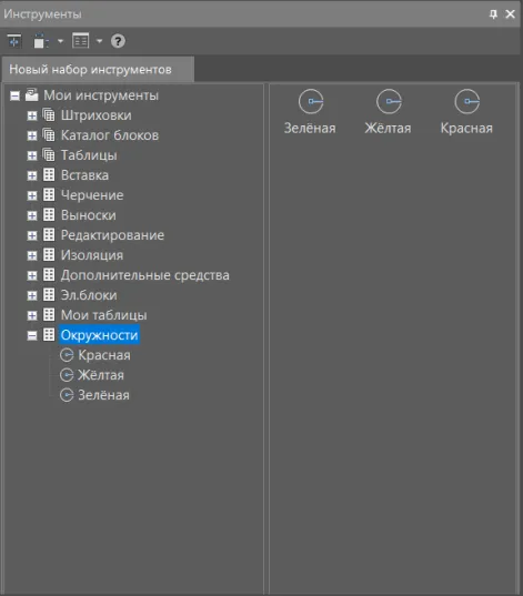Теперь в наборе Окружности имеются новые инструменты: Зеленая, Желтая, Красная, которые при их вызове позволят строить окружности с заданными свойствами в любом проекте nanoCAD (рис. 18).