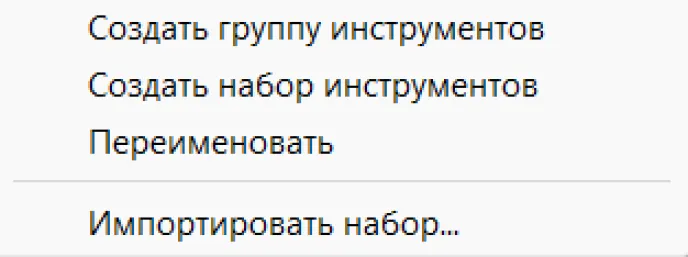 - Создать набор инструментов – позволяет создать новый набор для хранения инструментов (о группах и наборах мы поговорим ниже);