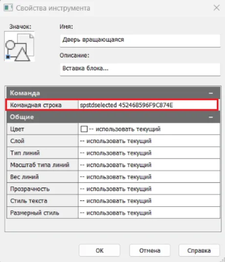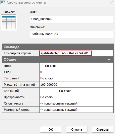 - Чтобы настроить инструмент конкретно на нашу таблицу, перейдем в свойства инструмента, после чего пропишем управляющую команду spstdselected и идентификатор таблицы в графе Командная строка (через пробел) – (рис. 42).
