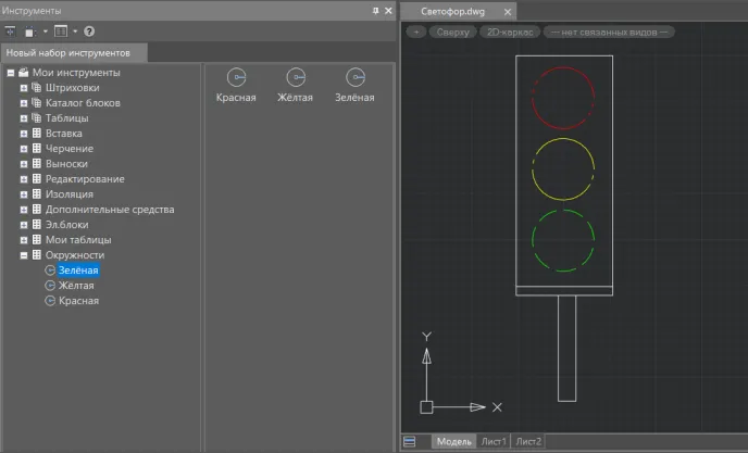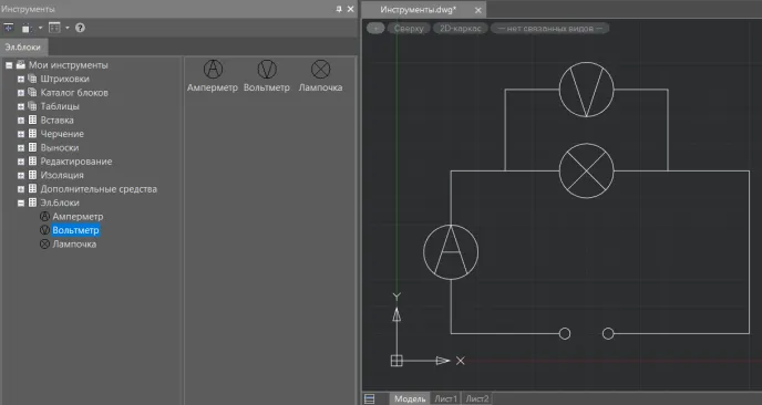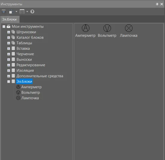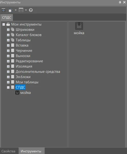 Панель Инструменты позволяет хранить пользовательские блоки, обеспечивая к ним доступ из различных проектов, что значительно упрощает работу и исключает риск потери того или иного важного блока.