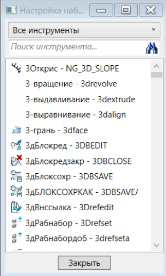 - Первый пункт меню – Настройка команд – открывает диалоговое окно Настройка наборов инструментов (рис. 12) с перечнем всех команд nanoCAD.