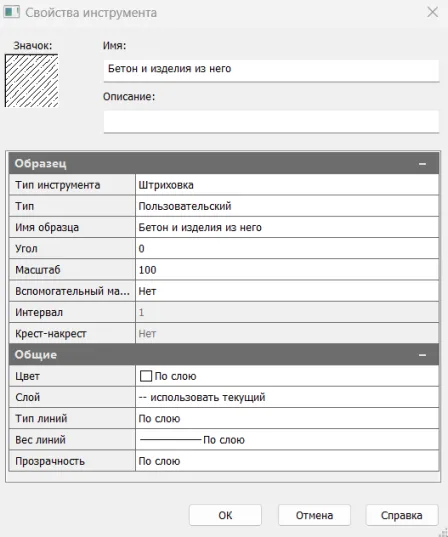 - Тип – список для выбора типа образца штриховки. Доступные типы: стандартный, из линий, пользовательский.