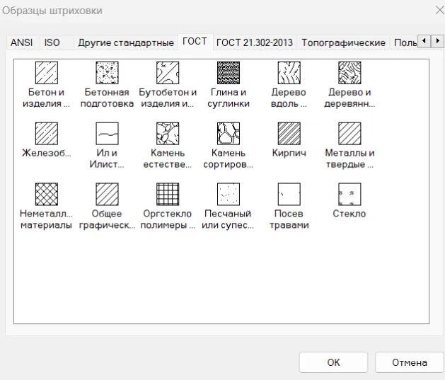 - Имя образца – список для выбора стандартных образцов штриховки. При нажатии на кнопку (...) открывается диалоговое окно Образцы штриховки (рис. 23), в котором можно выбрать образец из предоставленного списка (в соответствии со своим назначением образцы разнесены по соответствующим вкладкам, переключаться между которыми можно в верхней части этого окна).