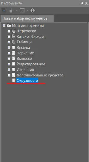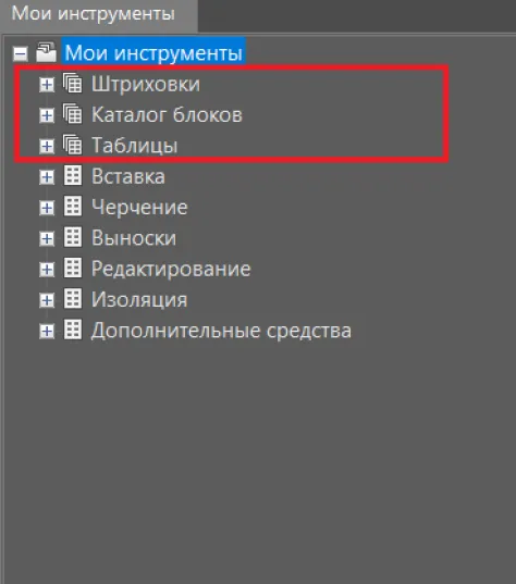 Как уже сказано, корневой узел Мои инструменты содержит все стандартные и пользовательские наборы и группы инструментов, являясь вершиной иерархии данной структуры.