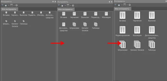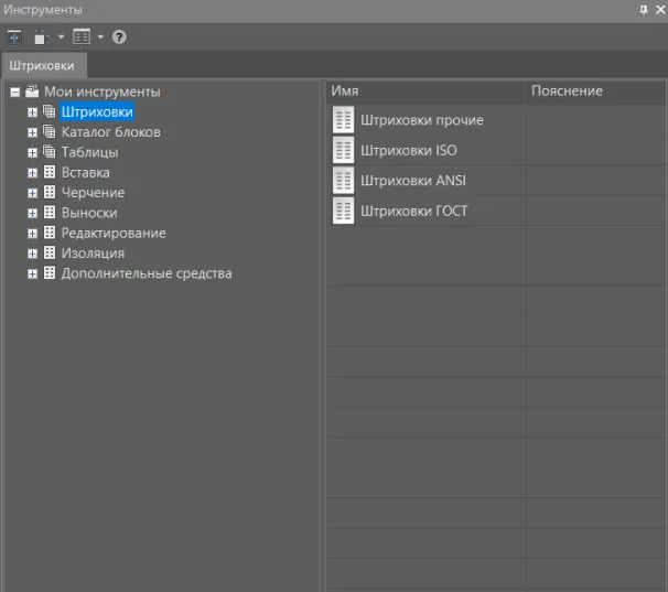 В каждой группе находятся стандартные наборы с соответствующими инструментами (штриховки, блоки, таблицы). Давайте разберем их свойства.