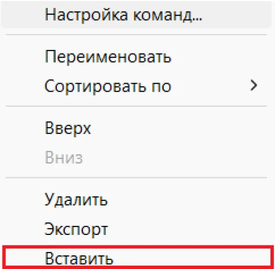 - Копировать – копирование выбранного инструмента в буфер обмена. При этом в контекстных меню всех наборов инструментов появляется пункт Вставить (рис. 14), позволяющий вставить скопированный инструмент из буфера в выбранный набор.