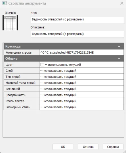 В нашем случае прописана команда ^C^C_stdselected 4E7F17942621534E. Это функция на языке DIESEL, которая по идентификатору таблицы обращается к базе элементов, где хранится данная таблица. О порядке добавления новой таблицы на панель Инструменты мы расскажем в разделе «Добавление пользовательских объектов».