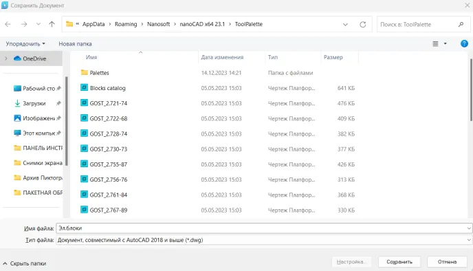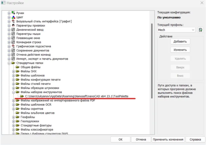 Содержимое функциональной панели Инструменты располагается по следующему пути: %AppData%\Roaming\Nanosoft\nanoCAD X\ToolPalette, где X – версия и сборка программного продукта.