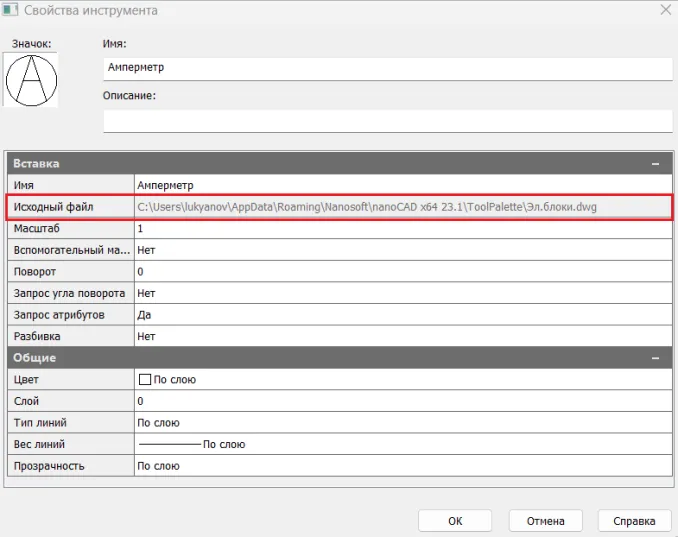 - Открыв свойства инструмента, можно увидеть, что в графе Исходный файл сохранился полный путь до данного файла (рис. 34).