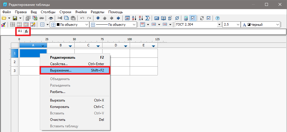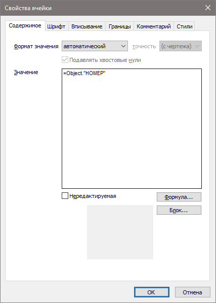 В nanoCAD есть специальное диалоговое окно Построитель выражений, позволяющее задавать параметры, функции, арифметические выражения и ссылки на свойства объекта для выбранной ячейки таблицы.