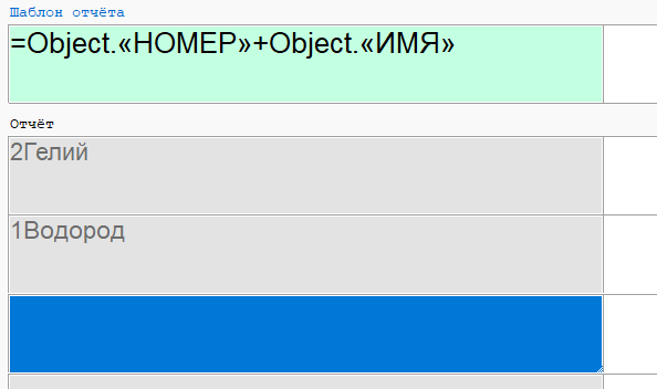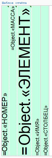 В окне Быстрый выбор выберем условие для скрытого атрибута РЯД . Затем, щелкнув правой кнопкой мыши (ПКМ) по ячейке шаблона отчета, внесем любые из свойств элементов, расположенных в первом ряду таблицы Менделеева. В одной ячейке через знак «+» можно вручную указать несколько свойств (рис. 9).