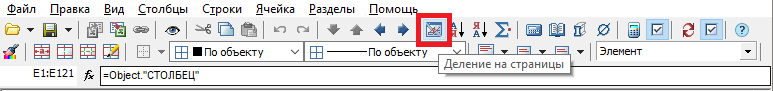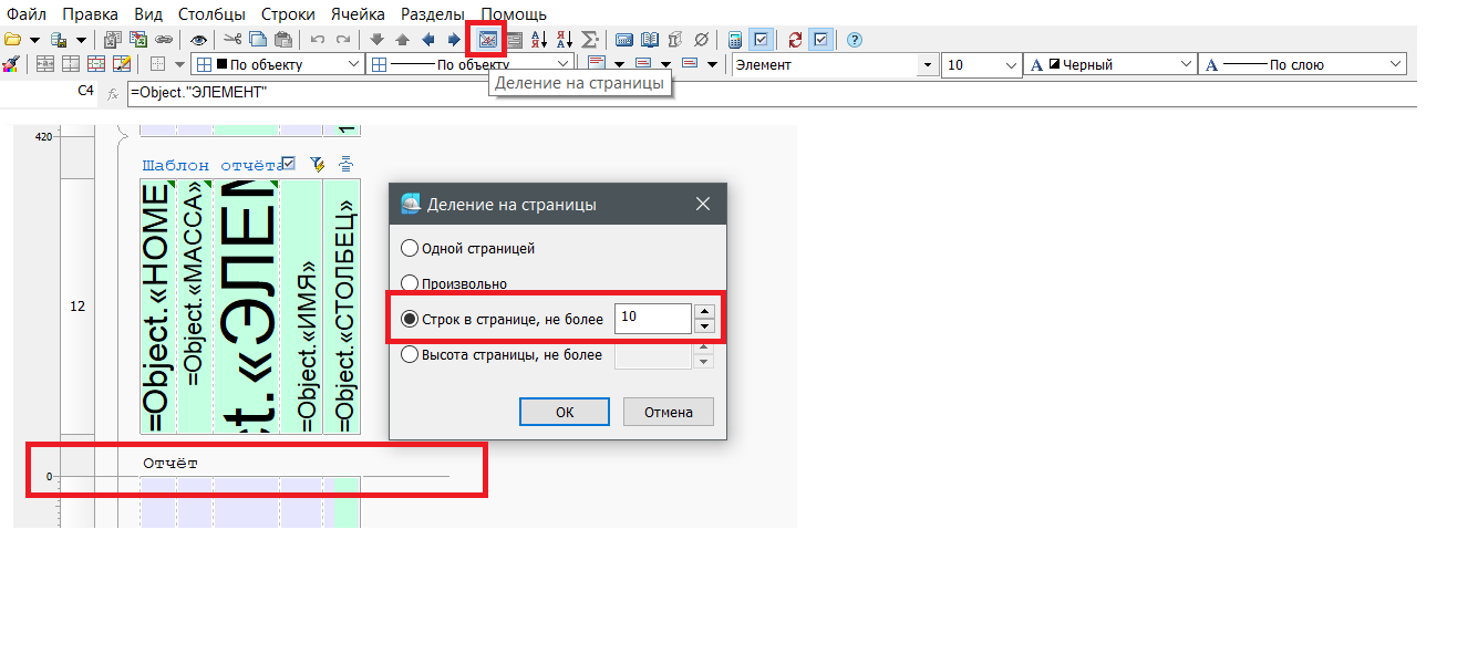 В диалоговом окне Деление на страницы укажем, как именно будет происходить деление: в нашем случае – не более 10 строк на одной странице (шаблоны отчетов не являются для страницы отдельной строкой, так как не отображаются в таблице). После деления на страницы в таблице появятся черточки, которые обозначают переход от одной страницы к следующей (рис. 16).