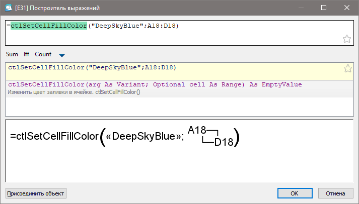 =ctlSetCellFillColor("DeepSkyBlue";A6:D6)   Голубой