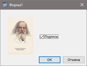 Для добавления диалога с переключателем в графической части редактора форм выберем в главном меню Вставка Флажок, зададим размеры и перейдем в окно свойств. В графе Текст укажем тот текст, для которого будет сделан переключатель (в нашем случае – «Подпись»), и зададим название переменной в графе Переменная: «Sign». Также рядом с переключателем можно вставить картинку. Для этого в главном меню выберем Вставка → Рисунок и зададим размеры картинки. В графе Данные диалога свойств выберем нужную картинку.