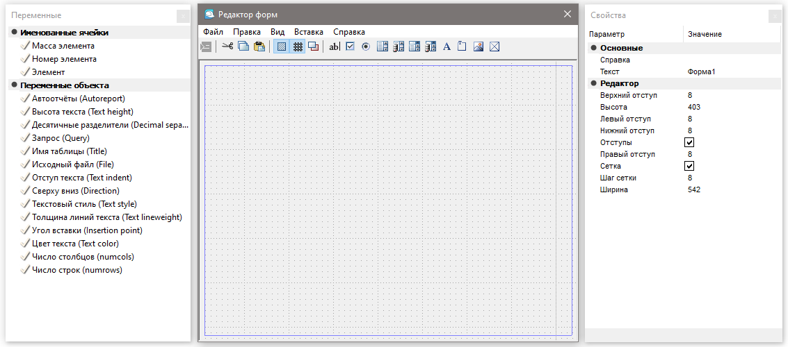 В главном меню полного редактора переходим в ФайлИзменить форму. Откроется окно редактора форм, окно свойств и переменных (рис. 24).