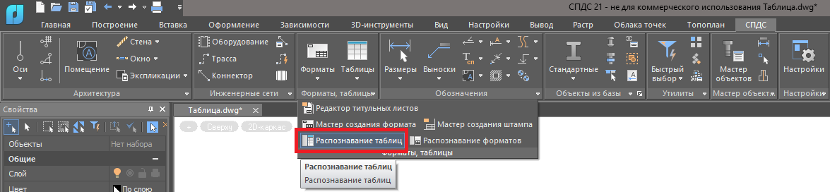 Кто-то может спросить, для чего проделывать столько операций, когда можно воспользоваться удобной командой распознавания таблиц сразу после вставки блоков? Эта команда есть в модулях «СПДС» и «Механика», и расположена она во вкладках СПДС/Механика, в группе Форматы, ТаблицыРаспознавание таблиц.