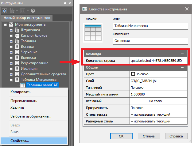 Далее переходим на функциональную панель Инструменты и перетаскиваем наши таблицы в нужный набор. Как вы уже заметили, при вызове таблицы возникает диалоговое окно создания таблицы. Чтобы сразу доставать из палитры нужную таблицу, необходимо войти в диалог свойств и прописать команду и идентификатор таблицы в графе Командная строка (через пробел) – например, как показано на рис. 29.