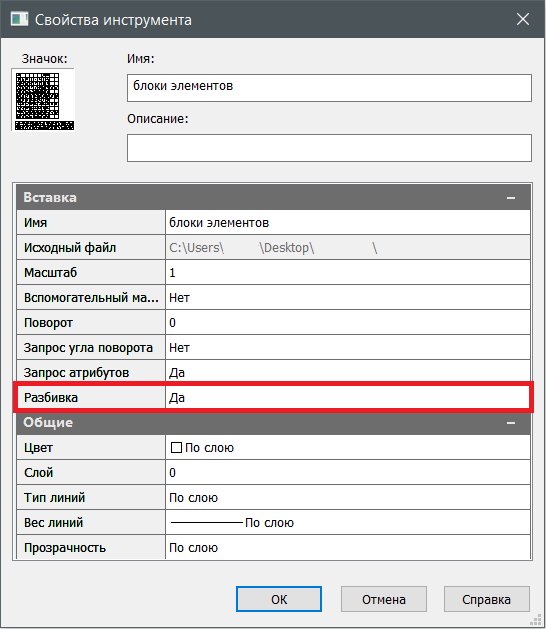 Также в палитру необходимо добавить все блоки элементов, иначе в новом документе таблица не найдет объекты для создания отчета, а чтобы можно было доставать их из палитры одним нажатием, из всех блоков элементов сделаем один – блоки элементов. Далее перетащим его в нужный набор и в свойствах для Разбивки укажем Да (рис. 30).