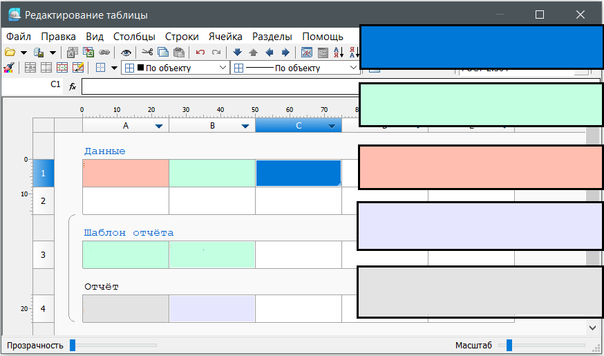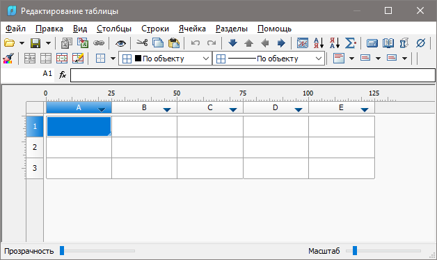 После того, как мы создали и вставили в пространство чертежа таблицу, вызовем полный редактор двойным щелчком левой кнопки мыши по таблице. Работа в полном редакторе таблиц (рис. 7) подобна работе в Excel. Окно редактирования включает главное меню, панель инструментов, область ячеек, каретки прозрачности и масштаба показа ячеек. Познакомимся с некоторыми из функций редактора таблиц.