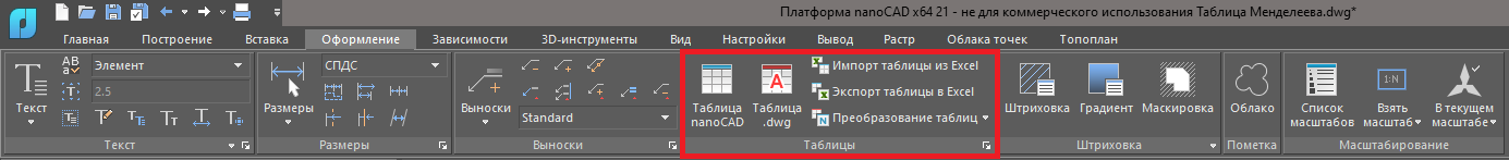 Чтобы создать отчет, вызовем диалоговое окно создания таблицы. Таблицы nanoCAD расположены во вкладке Оформление → группа ТаблицыТаблица nanoCAD (рис. 5). Правее расположены таблицы dwg, кнопки для мгновенного импорта/экспорта таблиц Excel, а также преобразования таблиц dwg в таблицы nanoCAD, и наоборот.