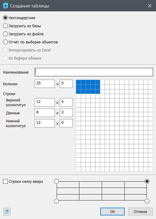 В открывшемся диалоговом окне Создание таблицы (рис. 6) выберем Нестандартная, укажем название таблицы, размеры ячеек, число строк и столбцов (их также можно задавать в графическом отображении таблицы) и наличие колонтитулов. В нижней части окна зададим точку вставки.