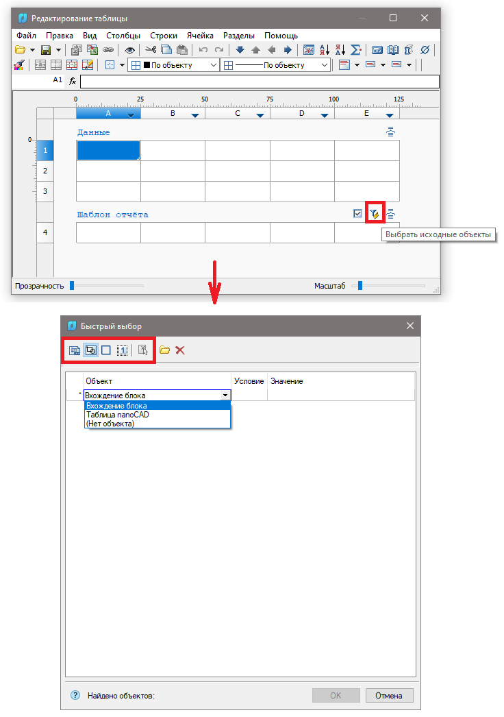 Сейчас в таблице активен раздел общих данных. Чтобы добавить раздел отчета, выберем в главном меню РазделыВставить раздел отчета. Для заполнения отчета данными атрибутов блоков следует выбрать, по каким объектам nanoCAD будет производить отчет. Воспользуемся Быстрым выбором (рис. 8).