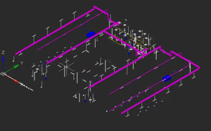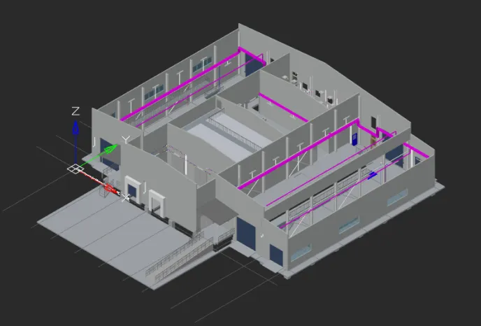 В рамках реконструкции объекта – одноэтажного здания собственного назначения с выходом на чердак и определенным набором сантехнических приборов, технологического оборудования и систем вентиляции – нам предстояло спроектировать сети силового электрооборудования и системы электроосвещения. Горизонтальная разводка распределительных линий предусматривалась открытой в лотках в помещении электрощитовой. Сети освещения в зоне досмотра должны быть скрыты за подвесным потолком в ПВХ-трубе и лотке, в электрощитовой – располагаться открыто в лотке. Групповые силовые сети должны идти от групповых щитов в металлическом лотке за подвесным потолком, опуски – скрыто в штробе. В качестве кабелей, питающих линии и групповые сети рабочего и аварийного освещения, предполагались кабели ВВгНГ(A)-LS и ВВгНГ(A)-FRLS; питающих сети и распределительные линии остальных электроприемников – ВВгНГ(A)-LS. Основную сложность представляли прокладка кабельных линий и увязка системы электроснабжения со сводными разделами для автоматической проверки в случае внесения изменений в проект.