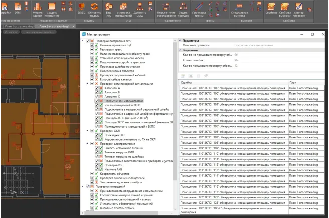 Согласно СП 484.1311500.2020, в nanoCAD BIM ОПС поддерживается объединение помещений в ЗКПС (зоны контроля пожарной сигнализации), разделение одного помещения на несколько ЗКПС. Установка каждой ЗКПС индивидуальна в рамках алгоритма принятия решения о пожаре. Согласно выбранному алгоритму, извещатели в ЗКПС размещаются с возможностью отображения зоны контроля каждого из них. Также реализованы алгоритмы контроля расстановки извещателей и их объединения в шлейфы.