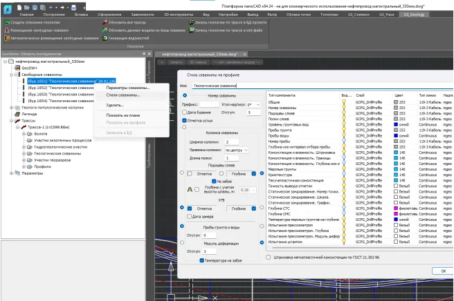 Создание и изменение пользовательских стилей изображений скважин различных типов на плане и профиле, геологических разрезов для разных типов трасс, геолого-литологических колонок