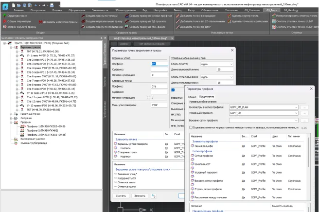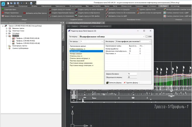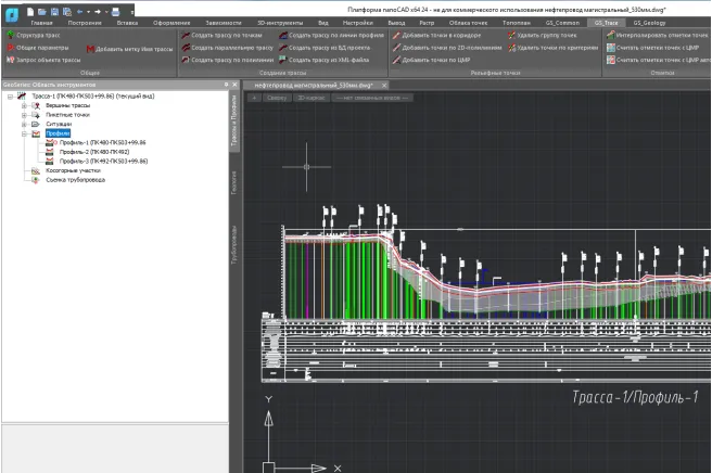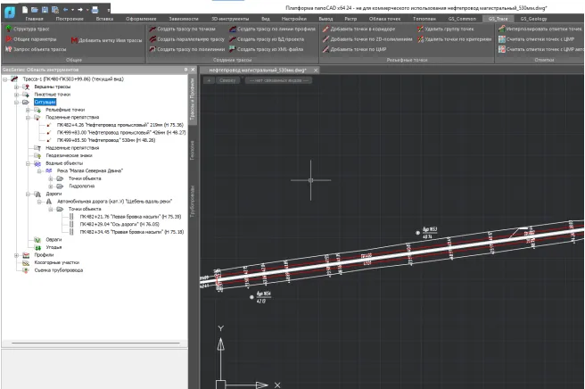 Компонент nanoCAD GeoSeries для выполнения комплекса работ по созданию трасс трубопроводов и других линейных сооружений и построения продольных профилей