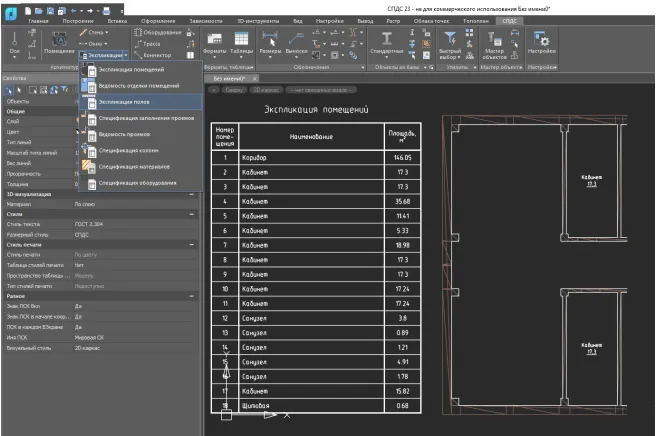 В модуле собраны инструменты для создания архитектурных поэтажных планов. Готовые отчеты позволят получить все необходимые ведомости и экспликации: ведомость отделки, экспликацию помещений и др.