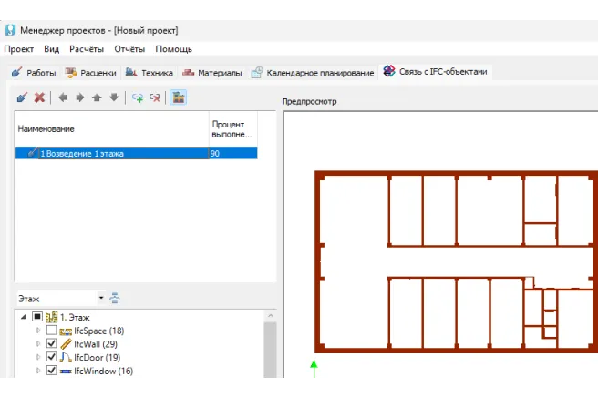 Возможность связывать импортированные модели здания с перечнем работ на строительной площадке, указывать степень готовности объекта в модели (объект окрашивается в цвет, соответствующий проценту от выполнения)