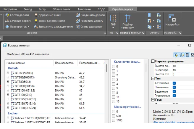 Возможность быстро подбирать грузоподъемную технику, строить график грузоподъемности и размещать опасную зону